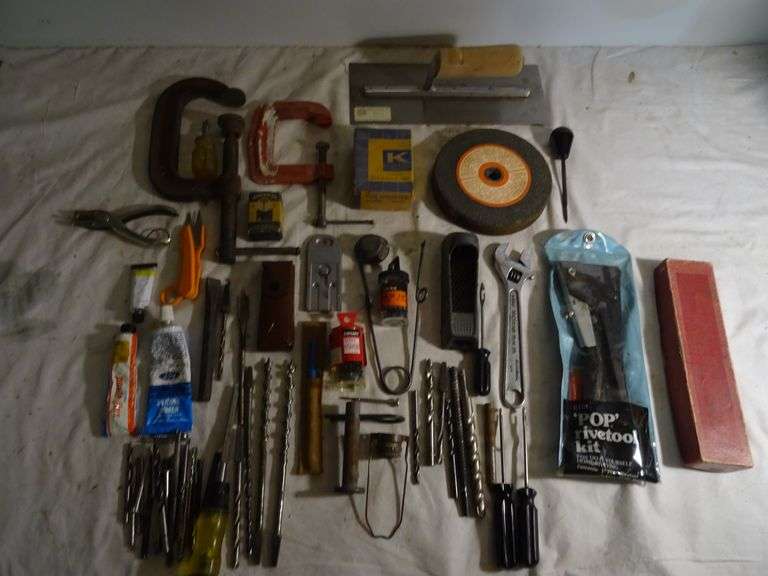 Flint striker, C clamp, drill bits, grinding disk, rivet gun and more