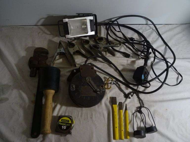 Vice clamps, chisels, rubber mallet, pipe wrench, vintage light