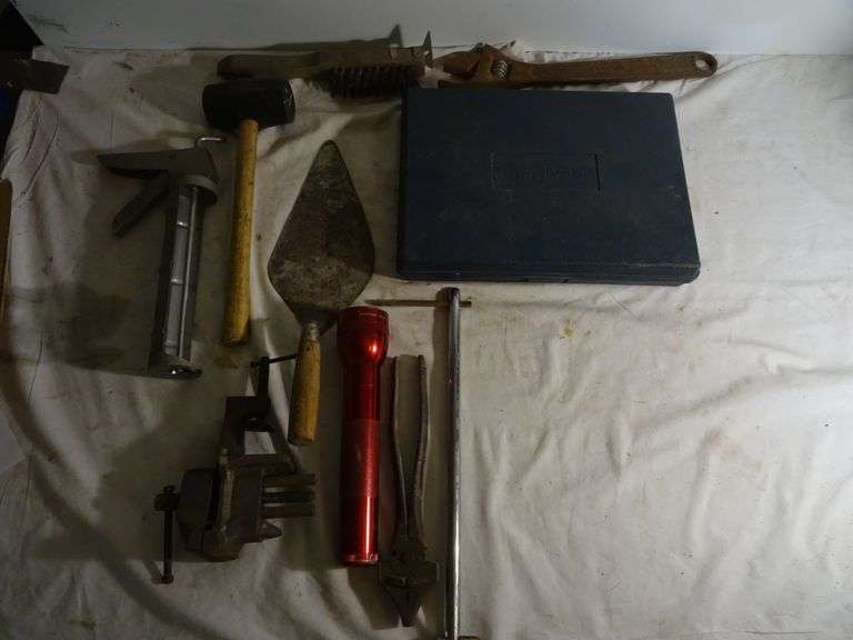 LOT 166 - Mega flashlight, Rubber Mallet, metric sockets, caulking gun