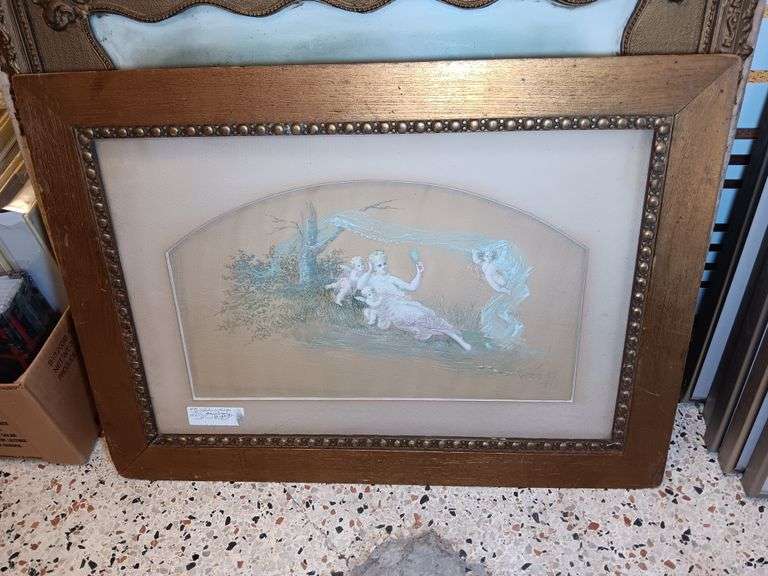 LOT 175 - Lady with Cherubs Painting on Fabric in Frame 26 x 19