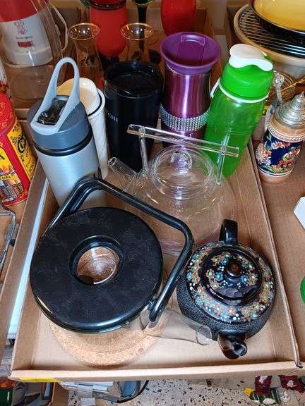 LOT 34 - Tumblers, (2) Glass Tea Pots, and Ceramic Tea Pot