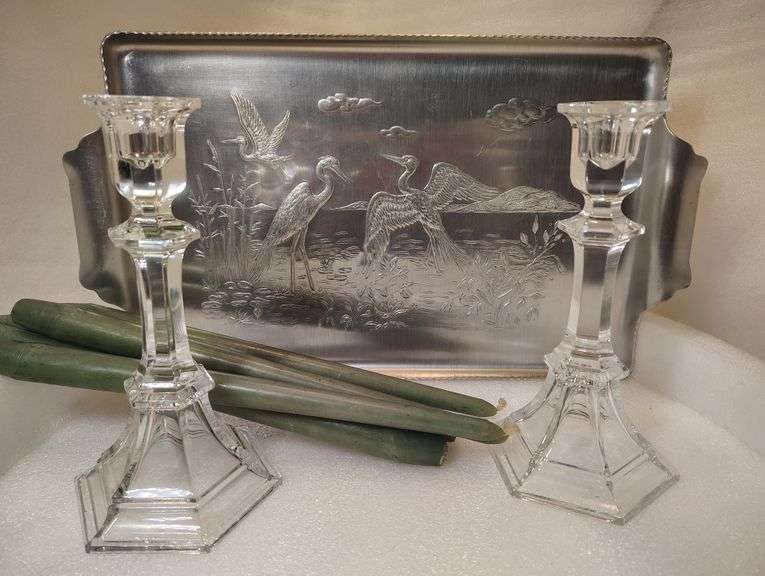 Crystal Aluminum, 2 Crystal Candle Sticks (one is chipped neat top) Aluminum Raised Stork Tray, 5 Vintage Candles