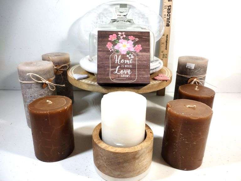 LOT 84 - 7 Candles, Wood Candle Holder, Wood Stand Tray, Block Decor & Mikasa Serving Tray