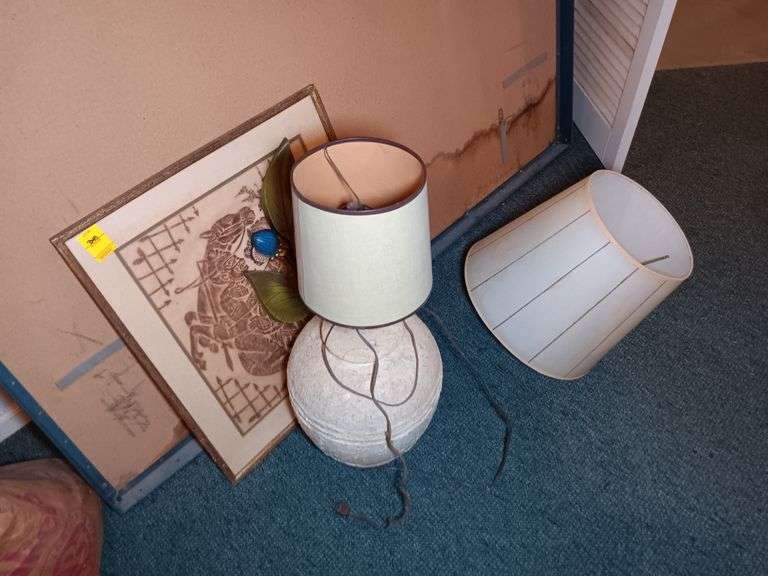 Ornate Wall Hangings, Stone Style Lamp, and Lamp Shades