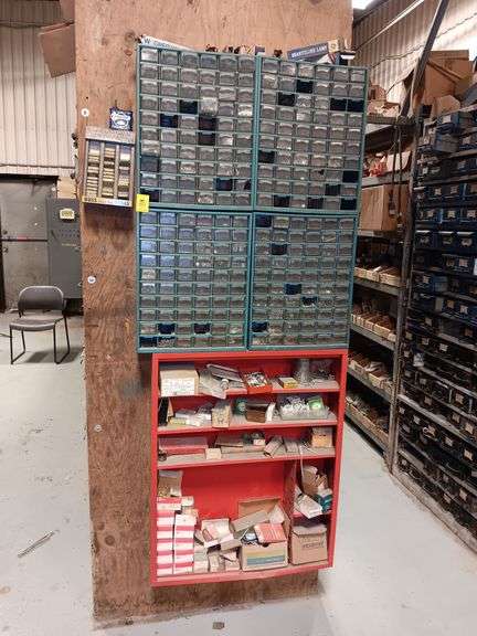 LOT 37 - Hardware Containers and Wall Shelf with Electrical Equipment