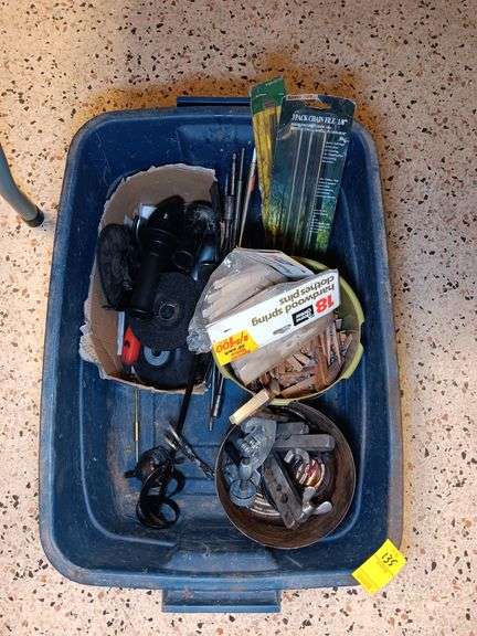 Tub of Assorted Hardware, Paint Mixer, Cloth Pins and Other Items