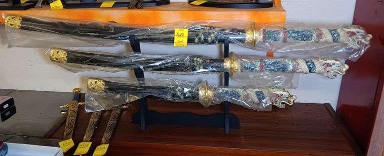 LOT K110 - (3) Piece Replica Decorated Samuri Sword Set with Stand