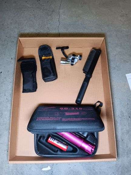 Flashlight Stun Gun, (2) Pocket Knife Cases, 8x20mm Mini Scope, and Other Items