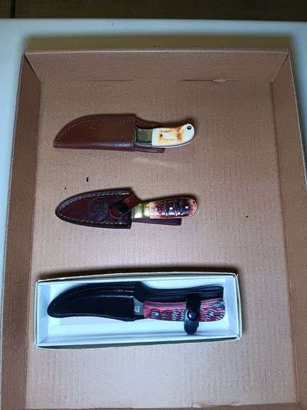 Valley Forge Cutlery Knife 2 1/2" Blade with Leather Sheath, Chipaway Cutlery Knife 3" Blade with Leather Sheath, and Whitetail Cutlery Knife 4" Blade with a Leather Sheath