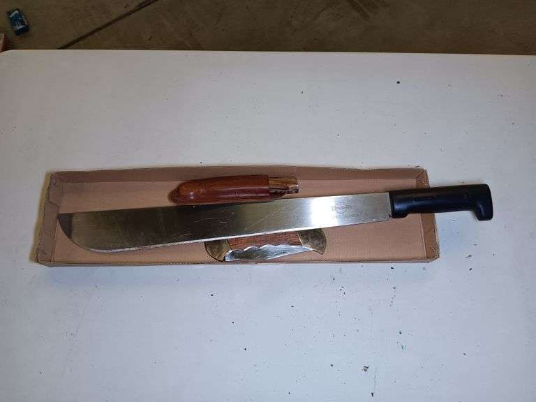 LOT K48 - Imacasa Machete, Folding Knife 5" Blade, and Sharp Fold-N-Lock Knife 5" Blade with Leather Sheath